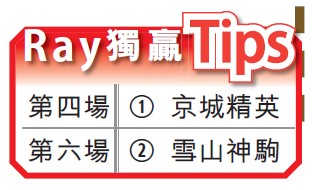 第六场四班1650米。「雪山神驹」转到告廐已有接近两年半,期间曾经在四班此程上阵9次,原来只得1场没有奖金,能够维持一段日子,说明了练马师在部署上处理得宜。此马上季跑同程先在四班轻取「钱程万里」,再於三班险胜「拣得正」,按理回降四班已重现威力,具出冷本钱。Ray