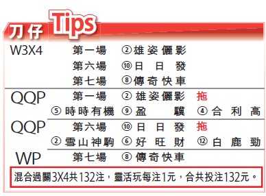 第七场三班1650米,「传奇快车」上季毫无表现,演出无疑令人失望,但评分已减至极有利水平,眼看状态並无问题,在此只要交出以往八成水準,已力足一争,加上得磅轻及靓档之助,值得重视。刀仔