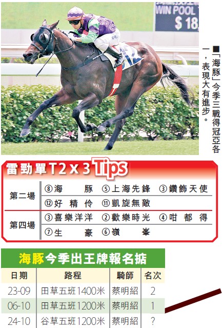 苗礼德马房今晚共出四驹,其中应以出争第二场五班1200米的「海豚」赢面最大;此驹过往用得较少,並因一直欠缺表现,评分已被减至极有利的水平,难怪季内评27分起步的牠,至今三仗共得冠亚各一佳绩。「海豚」上仗在蔡明绍胯下,以极轻鬆的姿态赢田草1200米,马房中人透露,此驹拼後状态依然大勇,今番移师谷草跑1200米,对手实力较上仗更弱,形势有利,要再添头马应无难度,乃稳阵马胆。