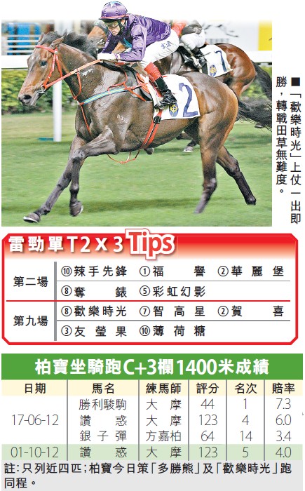 另外,蔡约翰今日派出多匹实力马参战,有消息传出,指第九场「欢乐时光」有力添食。此驹上仗初出即赢谷草1200米,走势只是小试牛刀;牠一早被视为高质素的中距离马,故今次改争1400米,计落才是其最适合的路程,上仗只是恃质凌人而已。今次「欢乐时光」升上三班作赛,实力必足够有馀,而状态更胜上回,力足再下一城。