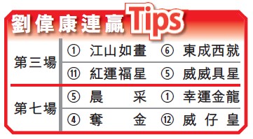 第三场王志伟将策骑「江山如画」排2档上阵,此驹历来7次於谷草1000米排1至4档起步,获1冠2亚1季1殿,当中三次排1至3档获冠亚季各一,證明排内档有利此驹发挥,加上人马同程合作7次获2冠2亚1殿,人马合拍加上档利随时能一放到底。同场「东成西就」今次初戴眼罩上阵,前季起贺廐15匹B1王牌马,获2冠3亚1季3殿,今次以相同手法出击要兼顾。