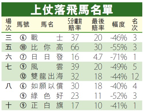第五场四班1400米。「比你高」上季两次出赛,分别角逐田草1200米和1400米,名次大落後,全无走势可言,是故,今季在1200米复出,赔率冷落,欠缺支持甚感合理,然而,闸前却由60倍大冷W,忽然跌至30倍开跑,最终跑入季军,说明了赛前那些注码绝非乱来。